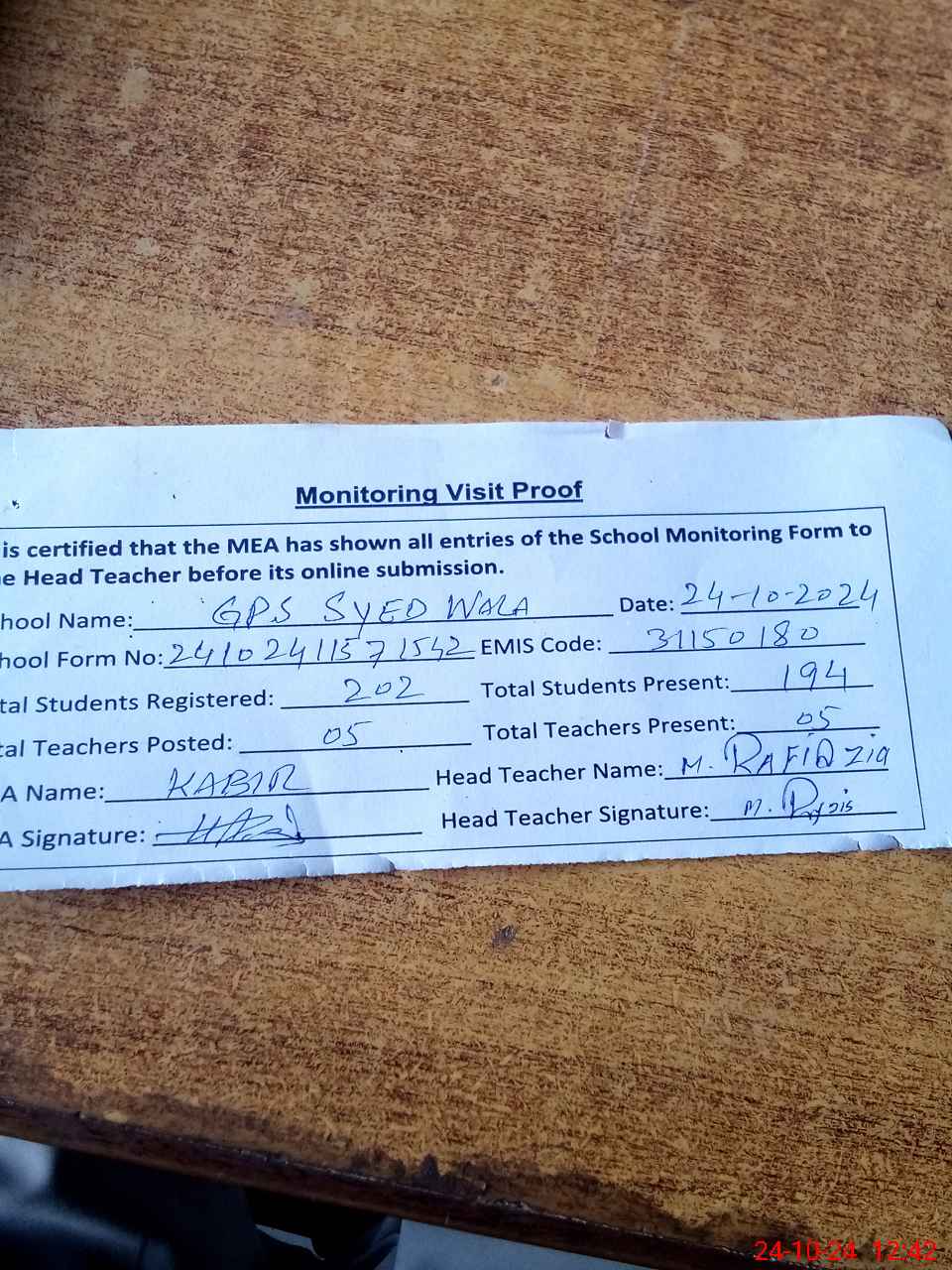 | EMIS Code: 31150180 | Name of School: GPS SAYED WALA | |||
