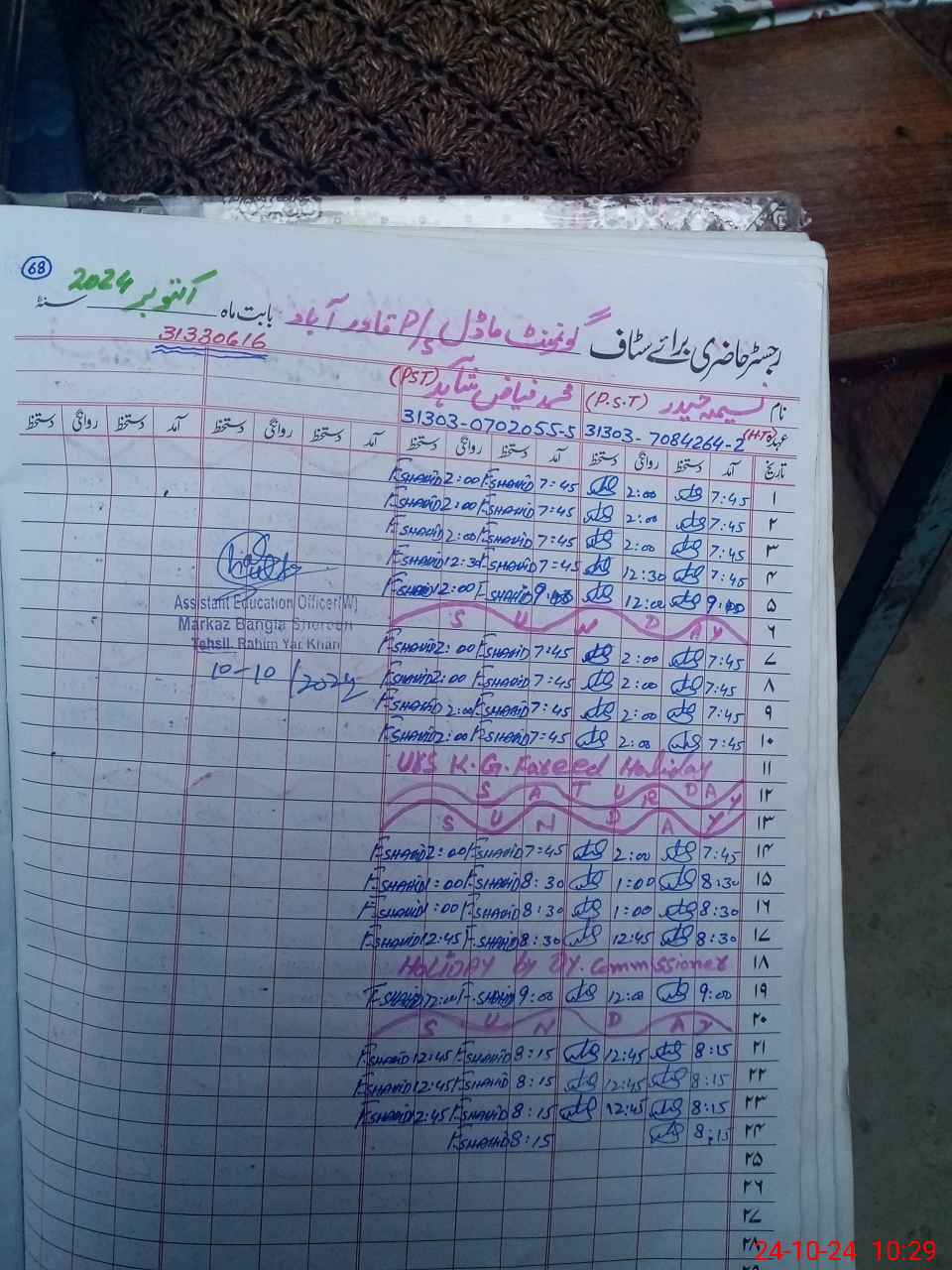 | Name: NA**** HA**** Designation: (School Headmaster's/Headmistress's) PST/PTC/JV Phone/Cell Number: 03**** |