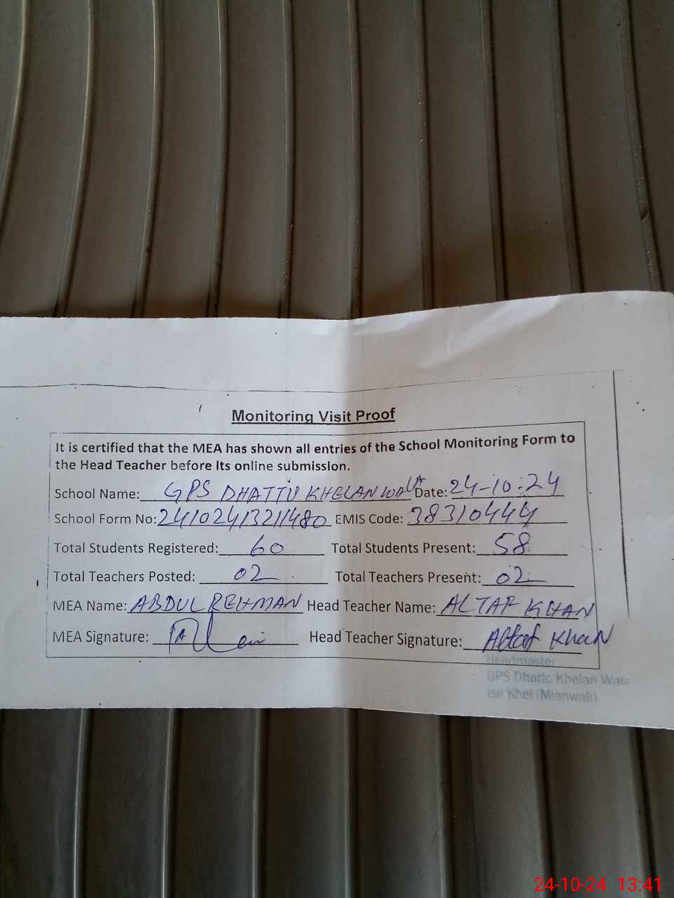 | Certified that this School was Inspected by the Undersigned MEA/DMO Today and the Information Stated Above is as Per Record. | |||||
