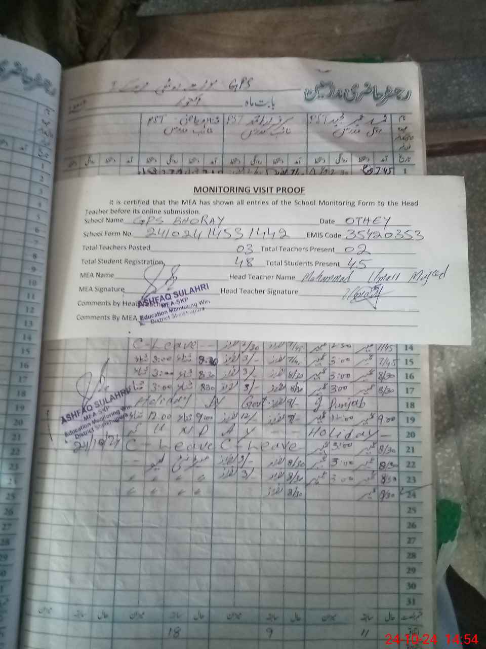 | Attendance Register | Head Teacher | MEA with School | Visit Proof |