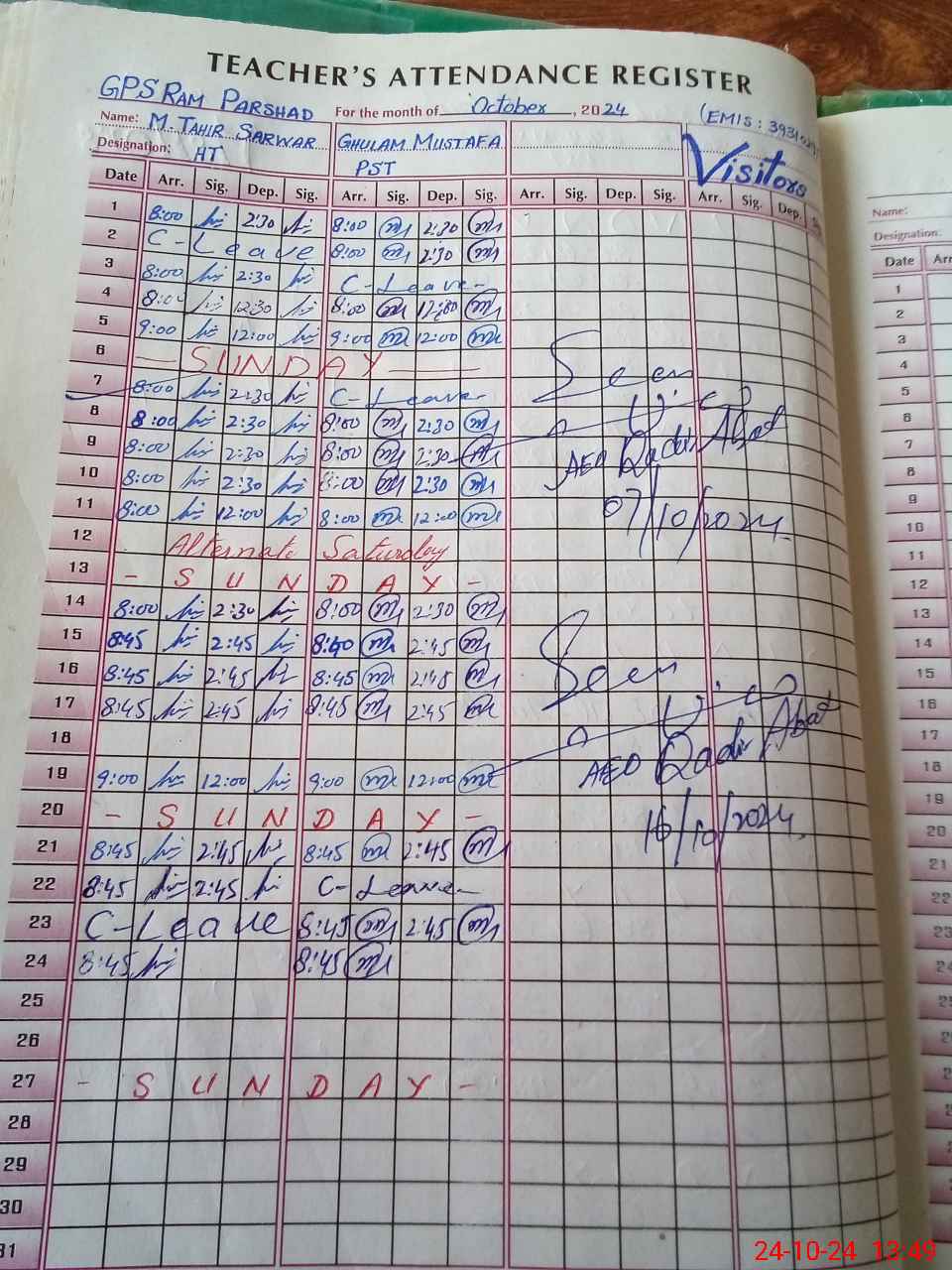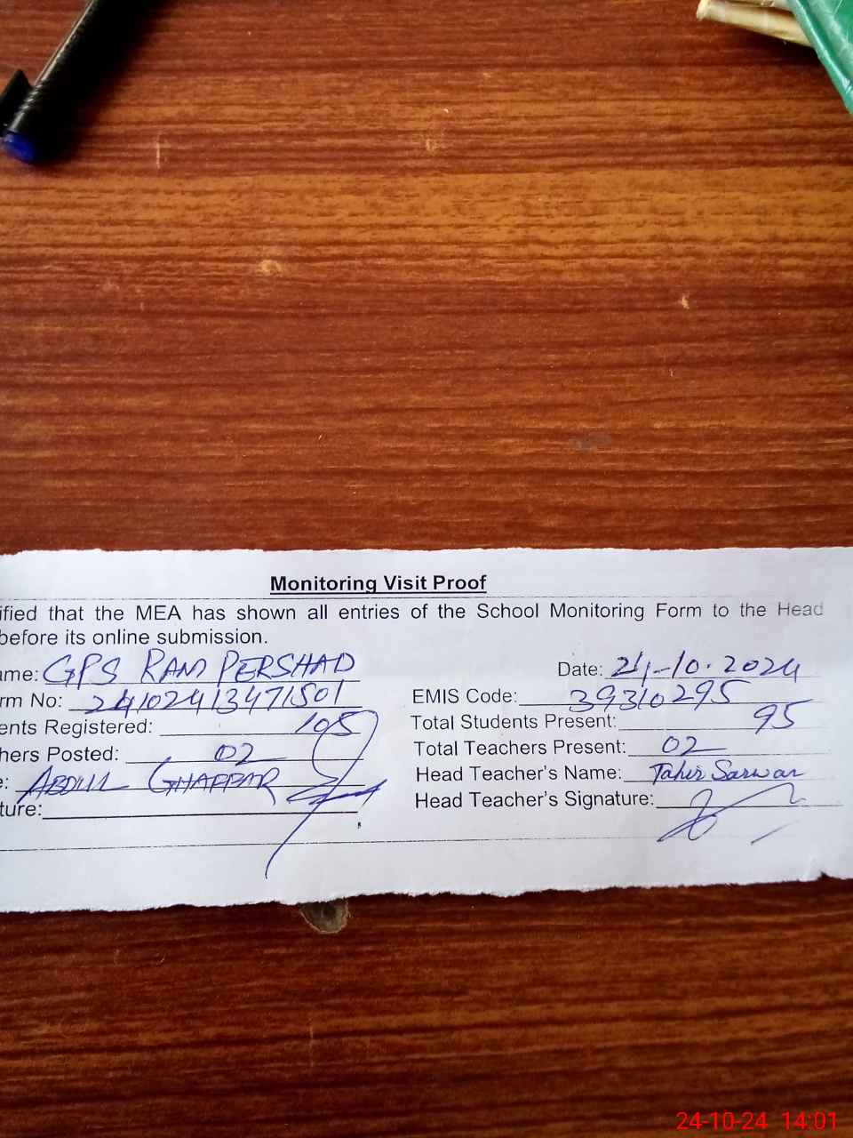 | Attendance Register | Head Teacher | MEA with School | Visit Proof |