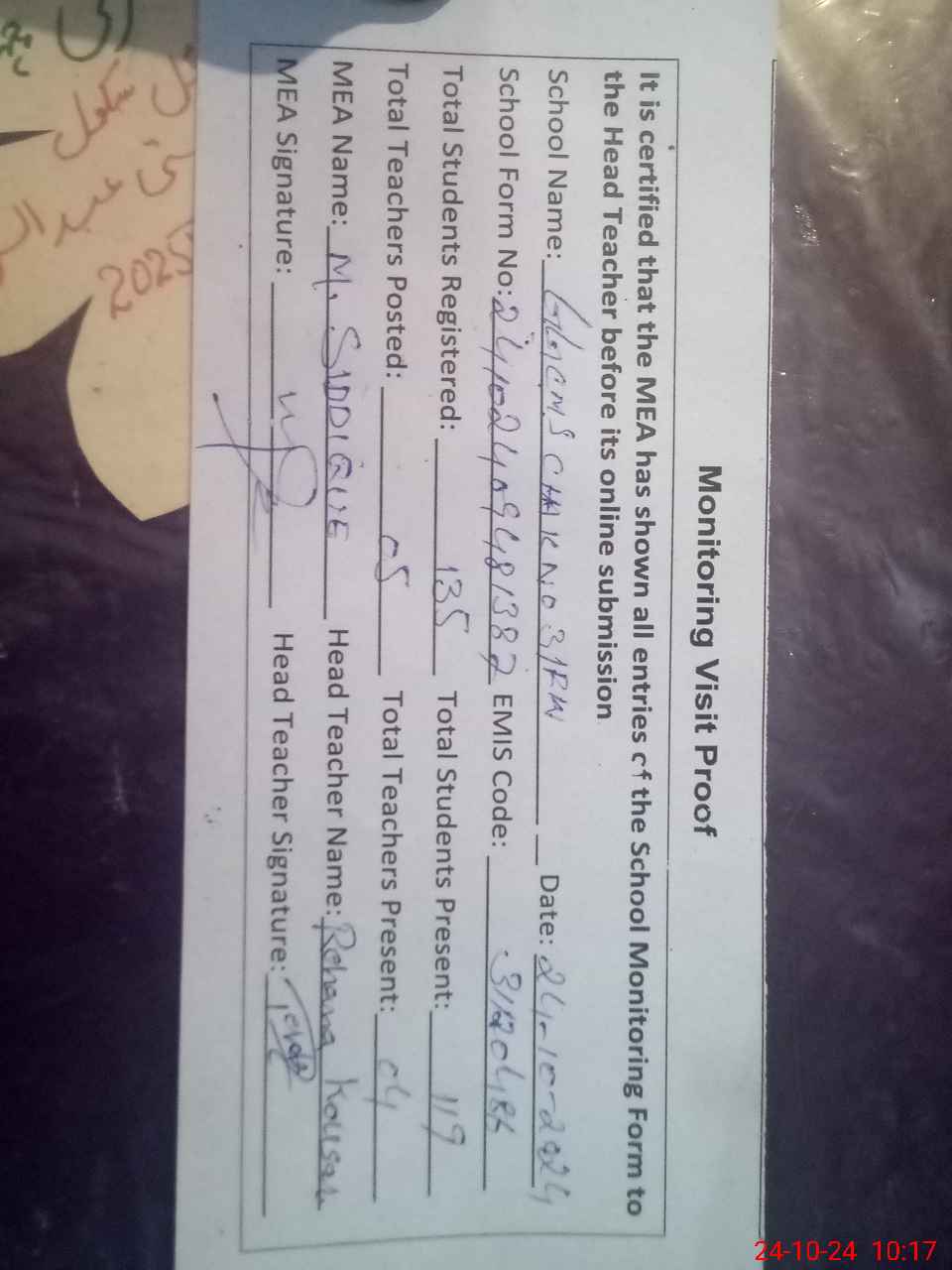 | Attendance Register | Head Teacher | MEA with School | Visit Proof |