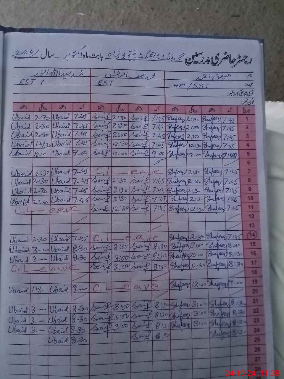 | CNIC | Full Name | Designation | R/C | Absence During Last Calender Month |