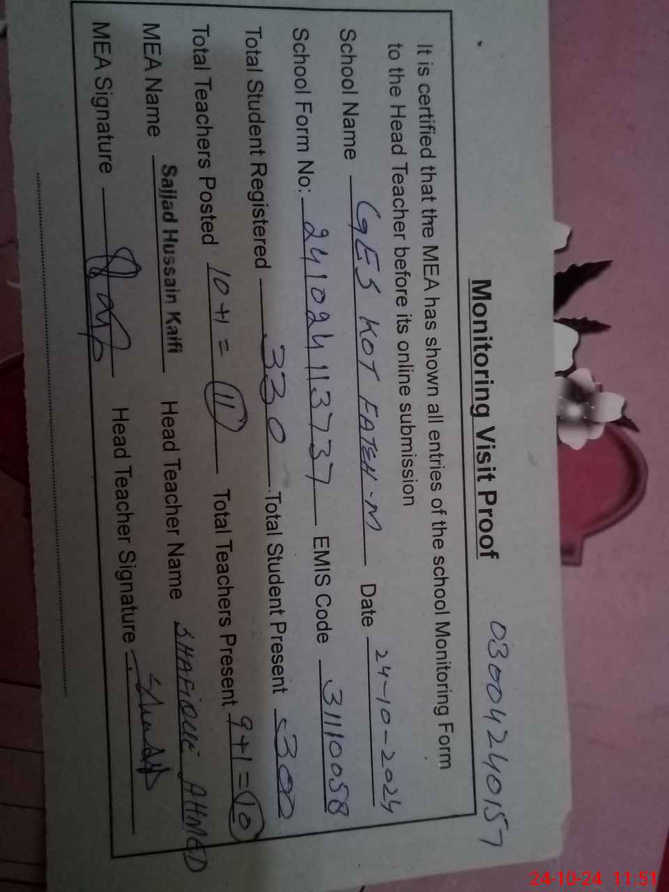 | Attendance Register | Head Teacher | MEA with School | Visit Proof |