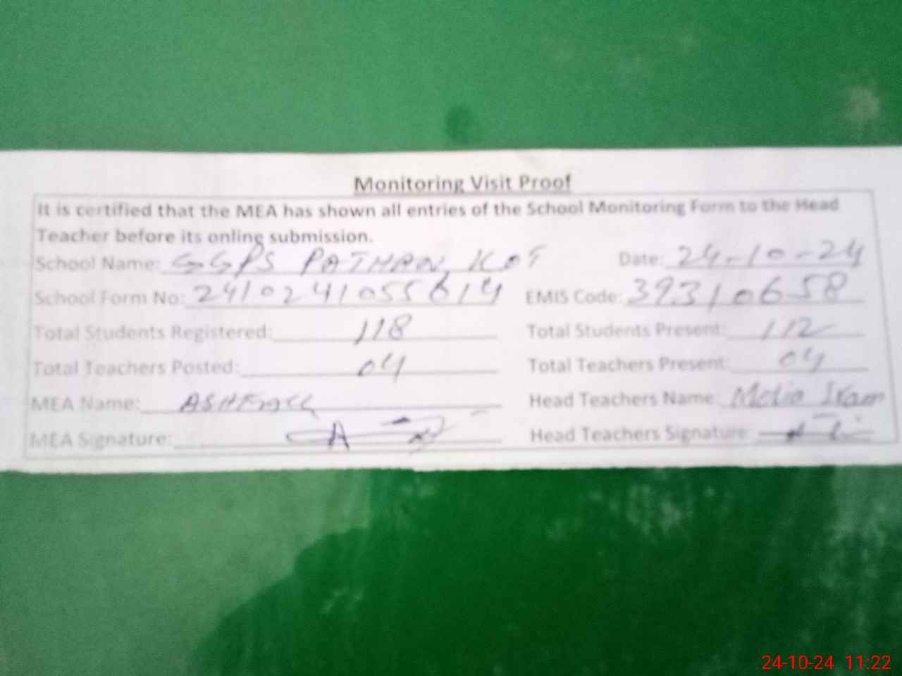 | Attendance Register | Head Teacher | MEA with School | Visit Proof |