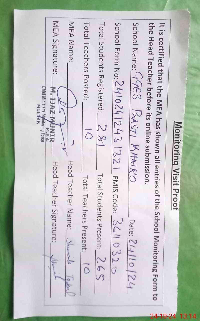 | EMIS Code: 36110320 | Name of School: GGES BASTI KHAIROO NEAR MUZAFFARABAD CANAL MULTAN | |||
