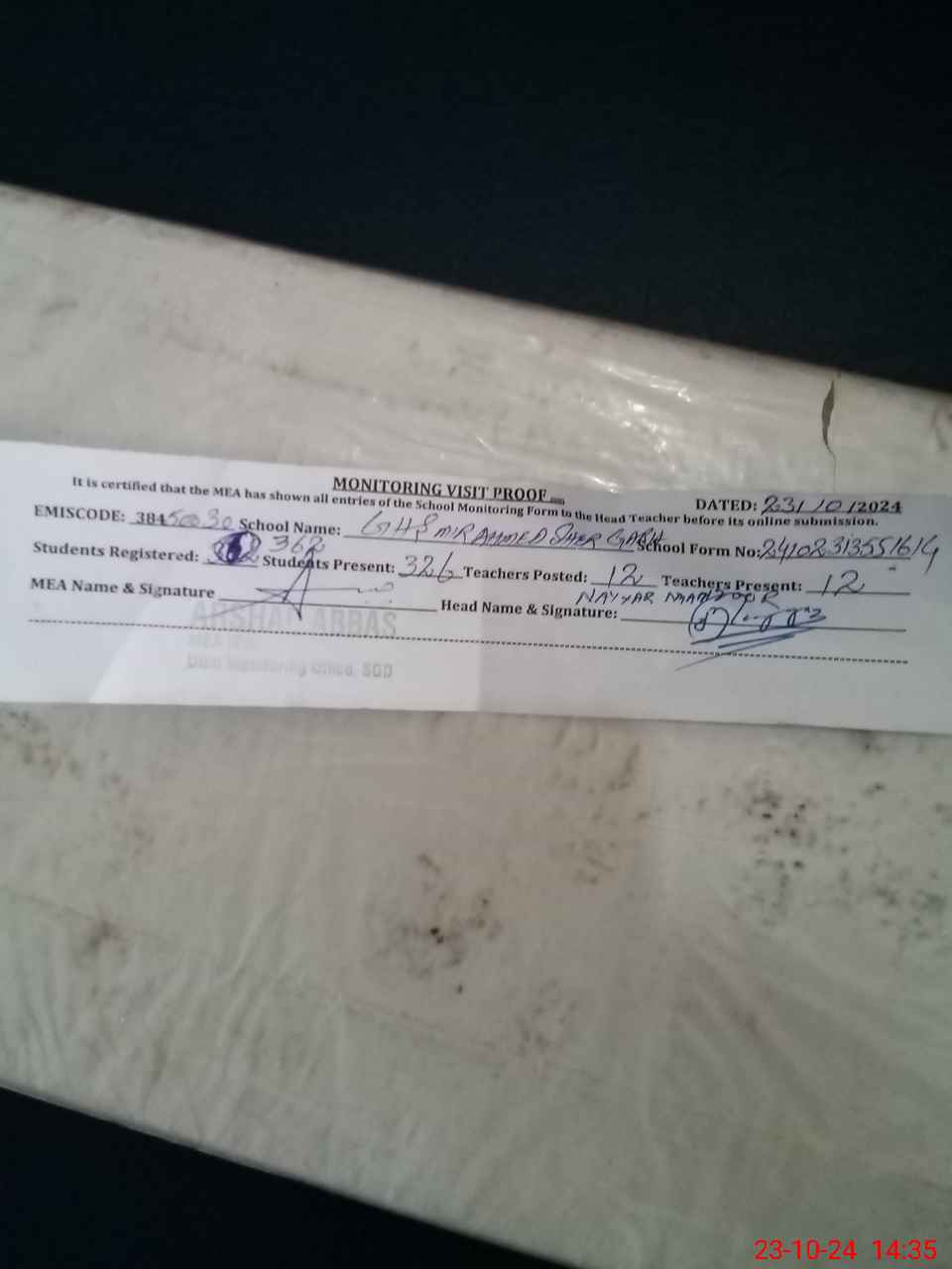 | Attendance Register | Head Teacher | MEA with School | Visit Proof |