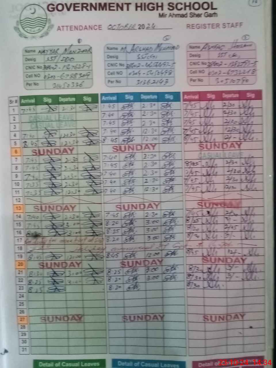 | CNIC | Full Name | Designation | R/C | Absence during last cal. month |