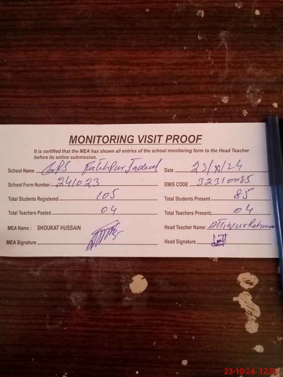 | EMIS Code: 32310085 | Name of School: GPS FATEH PUR JADEED | |||