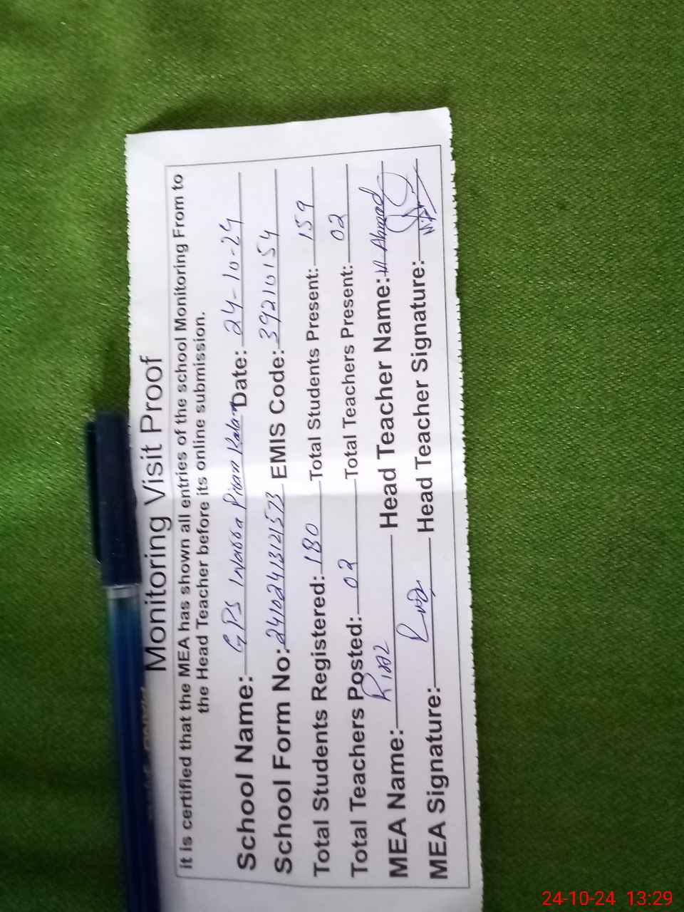 | Attendance Register | Head Teacher | MEA with School | Visit Proof |