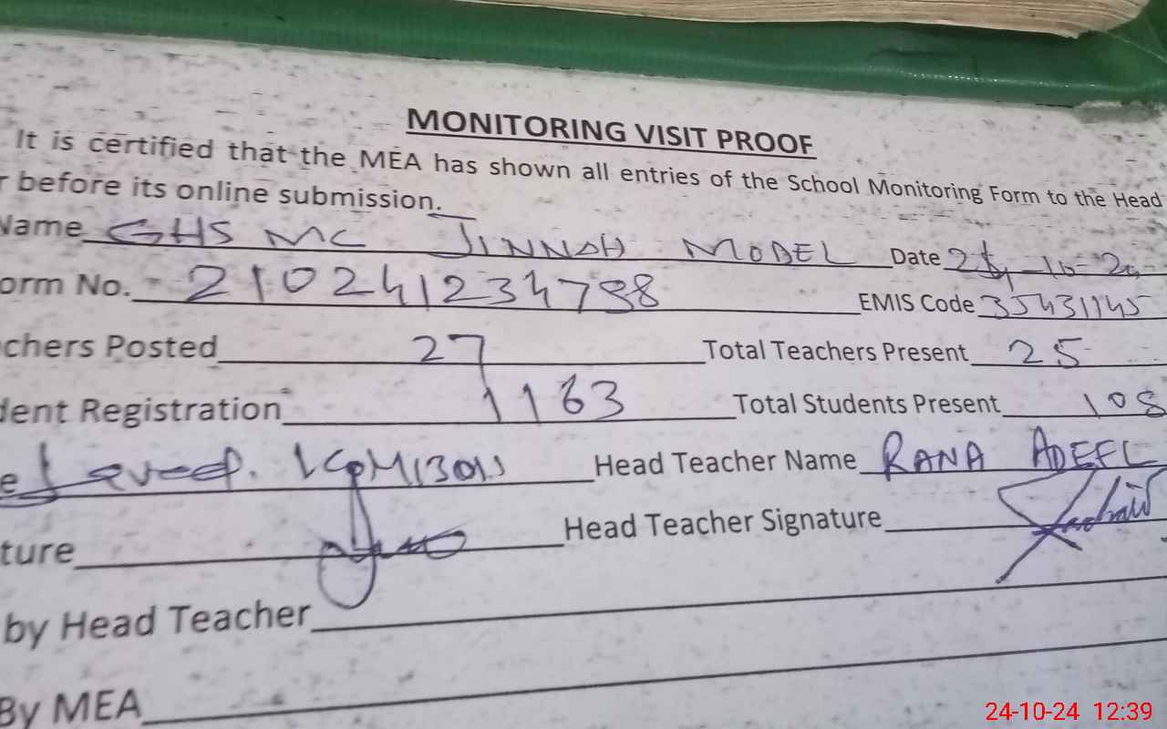 | Certified that this School was Inspected by the Undersigned MEA/DMO Today and the Information Stated Above is as Per Record. | |||||