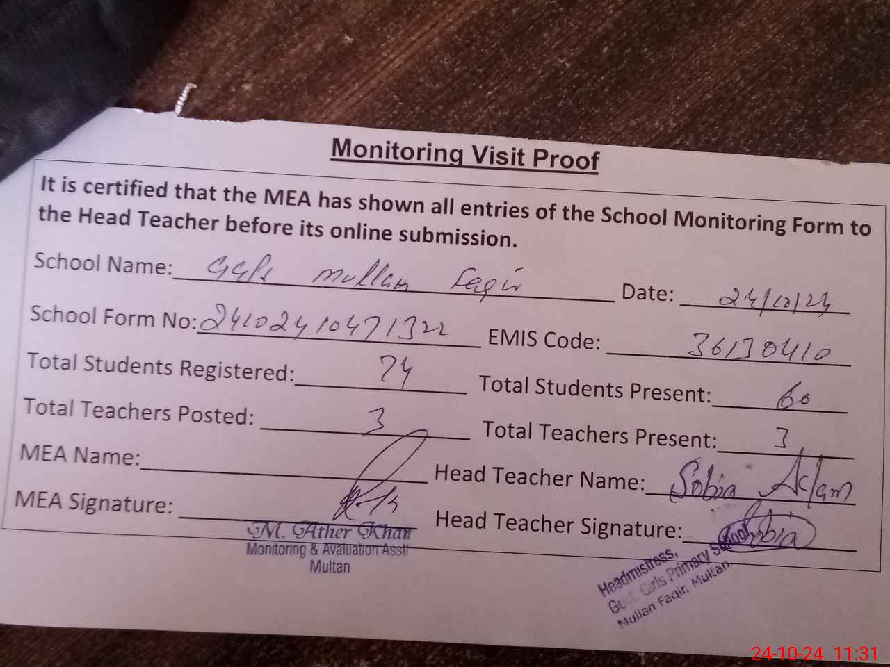 | Attendance Register | Head Teacher | MEA with School | Visit Proof |