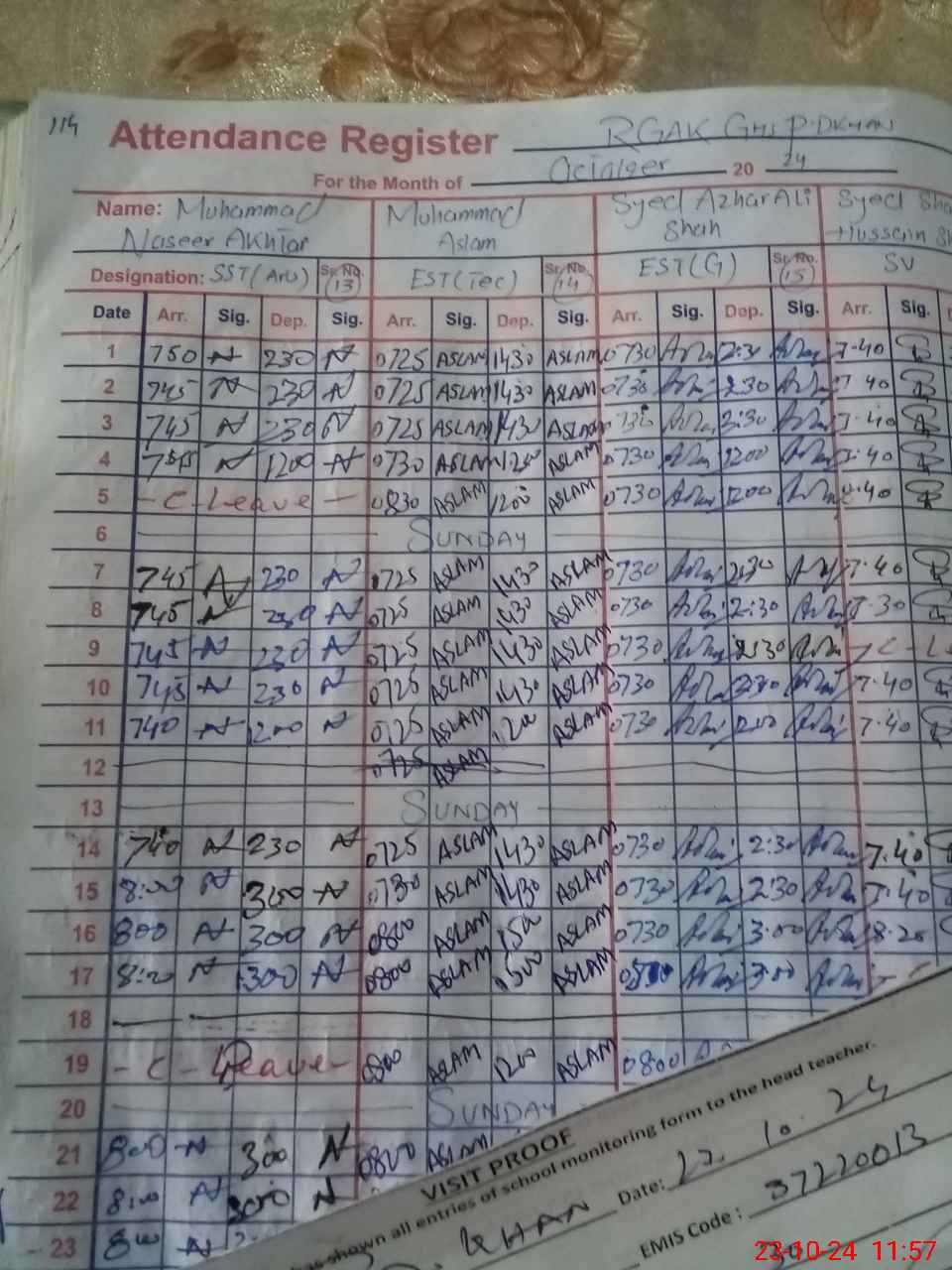 | CNIC | Full Name | Designation | R/C | Absence during last cal. month |