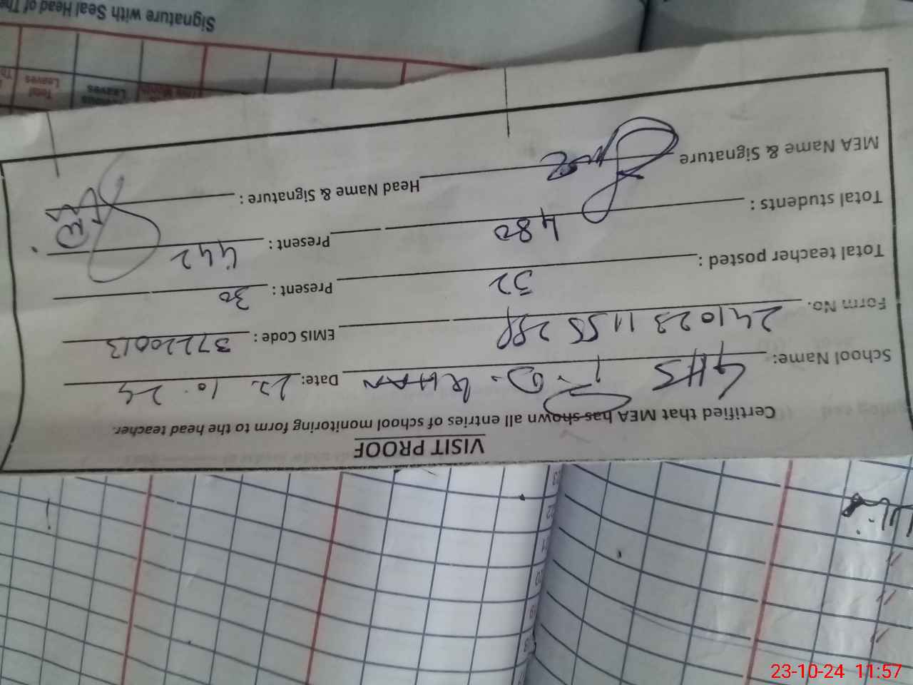 | Attendance Register | Head Teacher | MEA with School | Visit Proof |