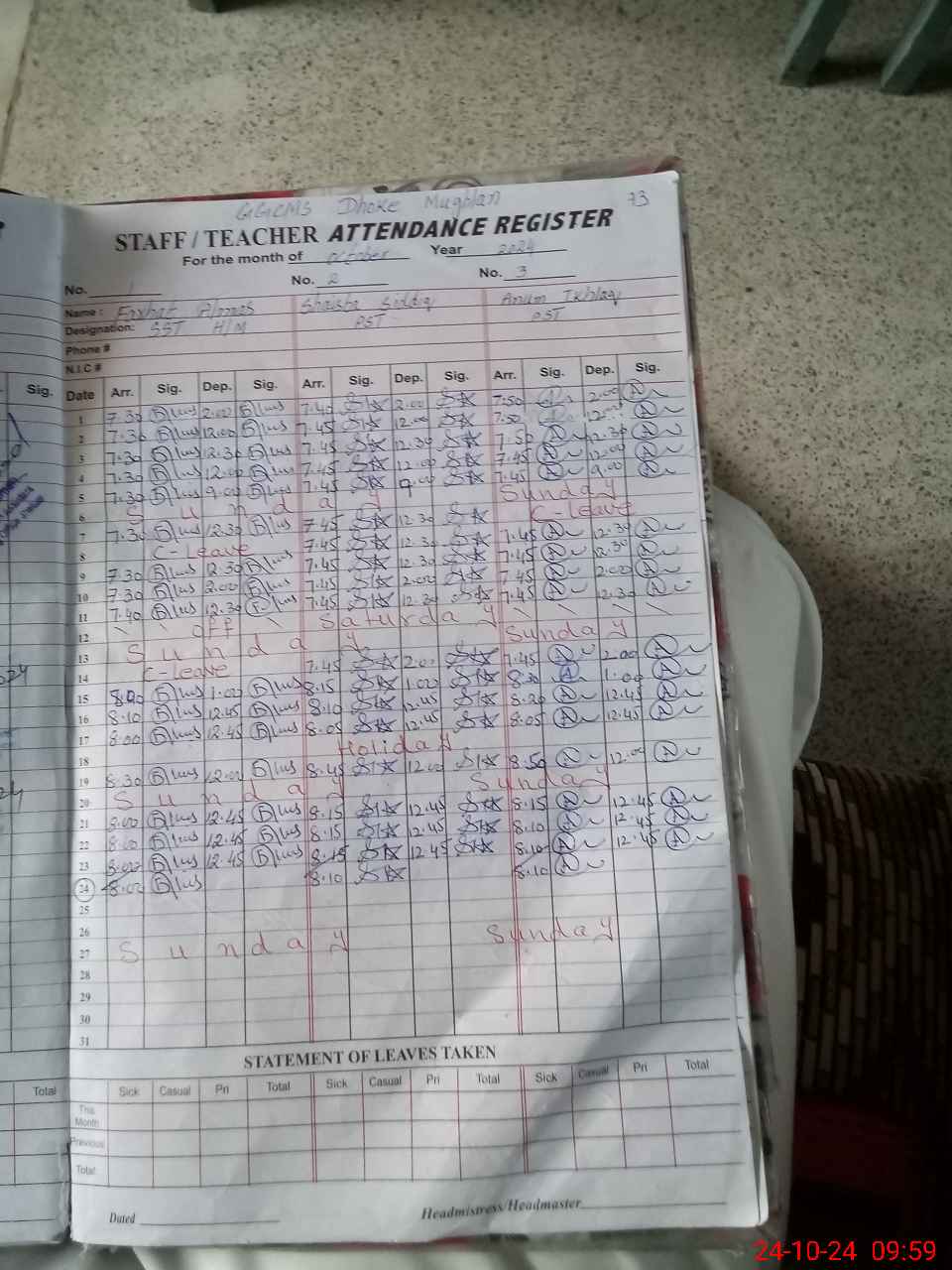 | Leave | Duty | Absent | Maternity | Medical | Ex- Pak |
