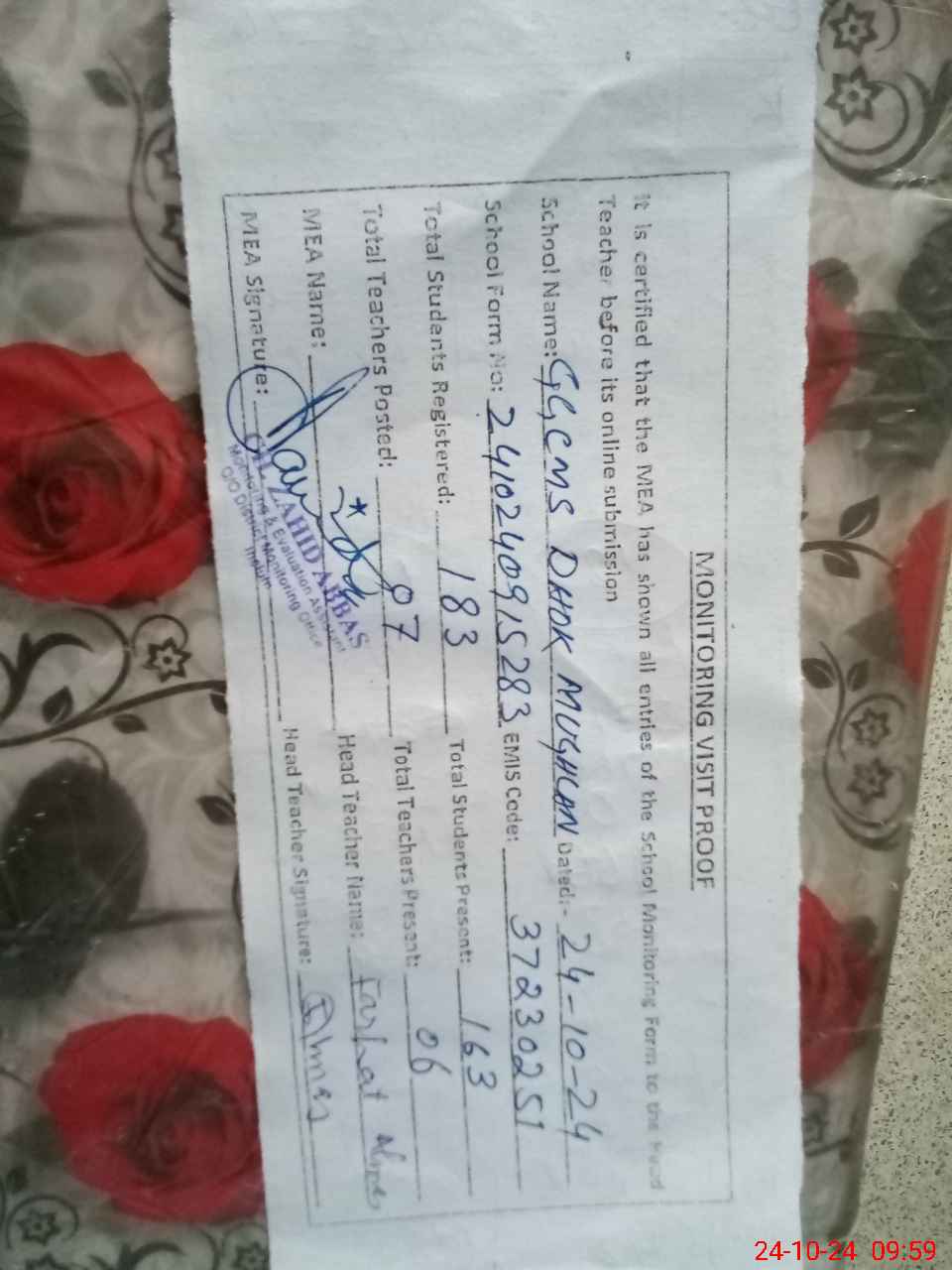 | Certified that this School was Inspected by the Undersigned MEA/DMO Today and the Information Stated Above is as Per Record. | |||||