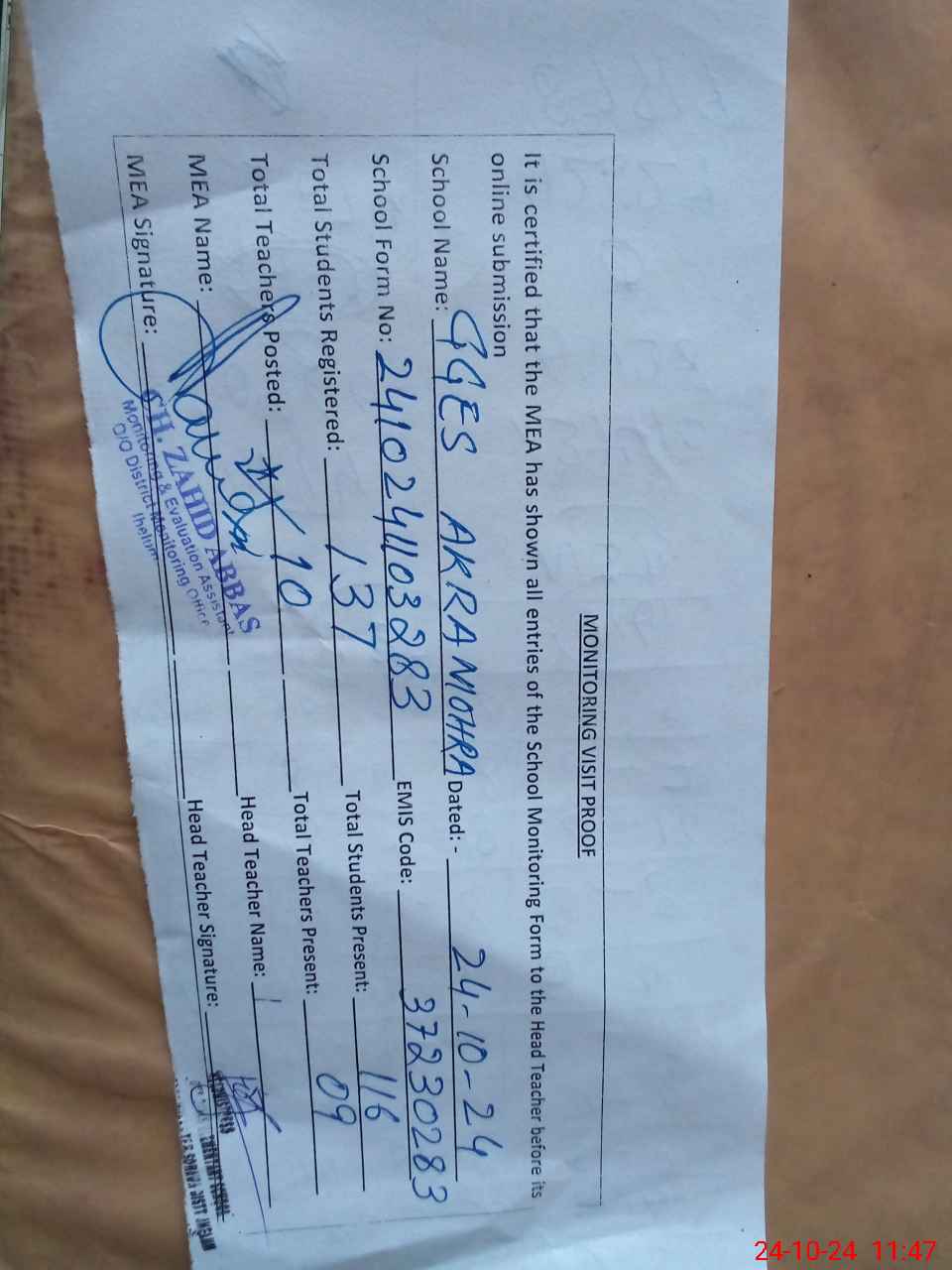 | Monitoring Date: 24-10-2024 | Start Time: 24-10-2024 11:03 AM | End Time: 24-10-2024 11:49 AM | Name of MEA: Za**** Ab**** | |