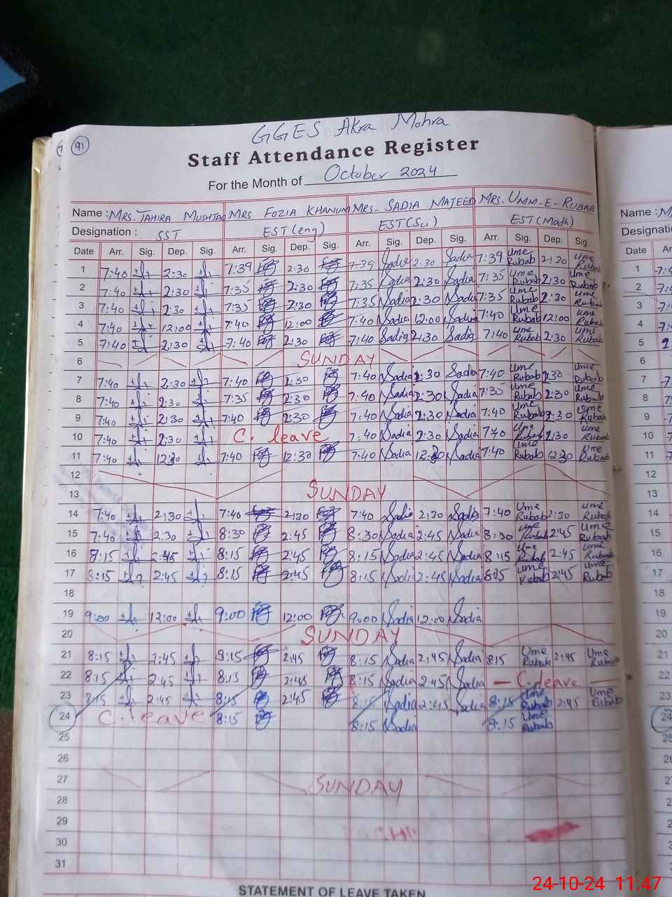 | Leave | Duty | Absent | Maternity | Medical | Ex- Pak |