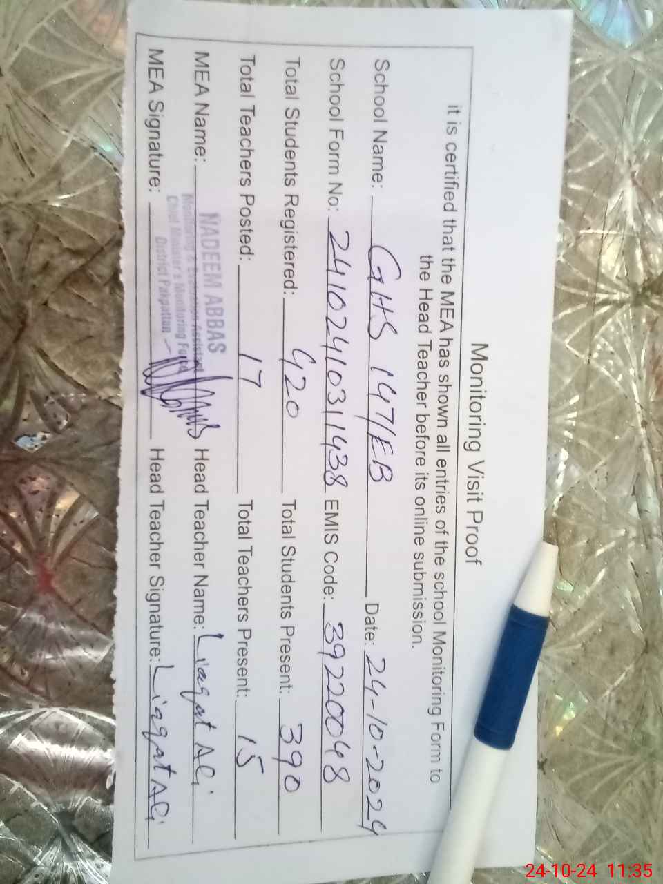 | Attendance Register | Head Teacher | MEA with School | Visit Proof |