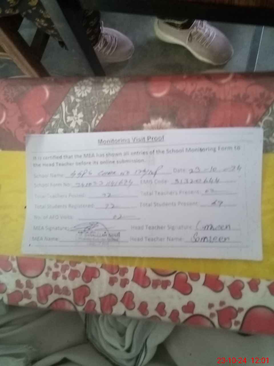 | Attendance Register | Head Teacher | MEA with School | Visit Proof |