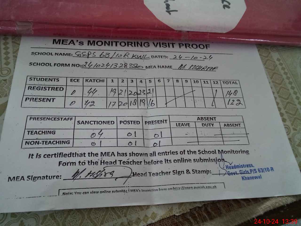 | Attendance Register | Head Teacher | MEA with School | Visit Proof |