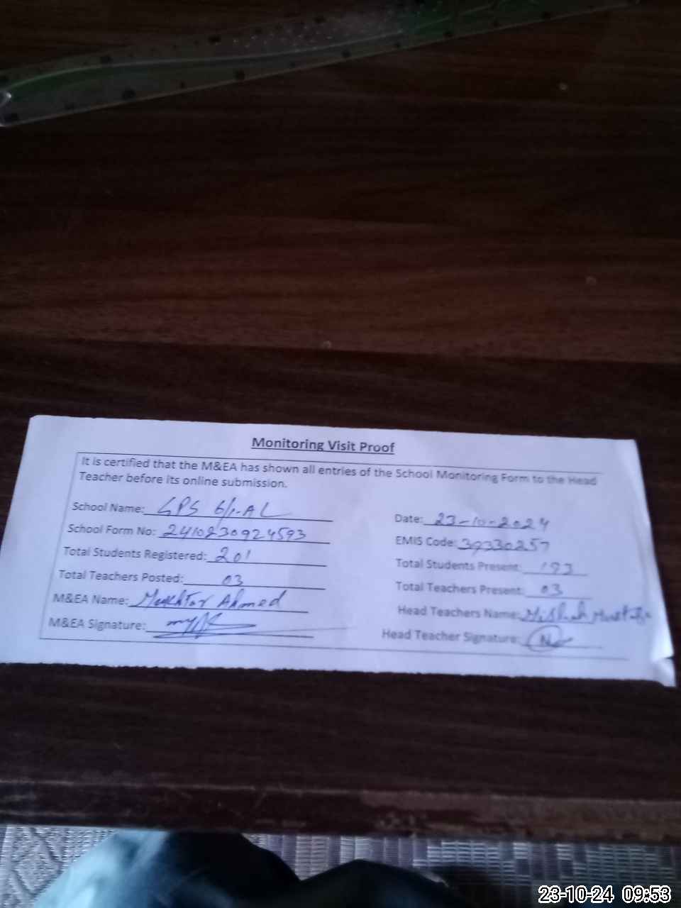 | Attendance Register | Head Teacher | MEA with School | Visit Proof |