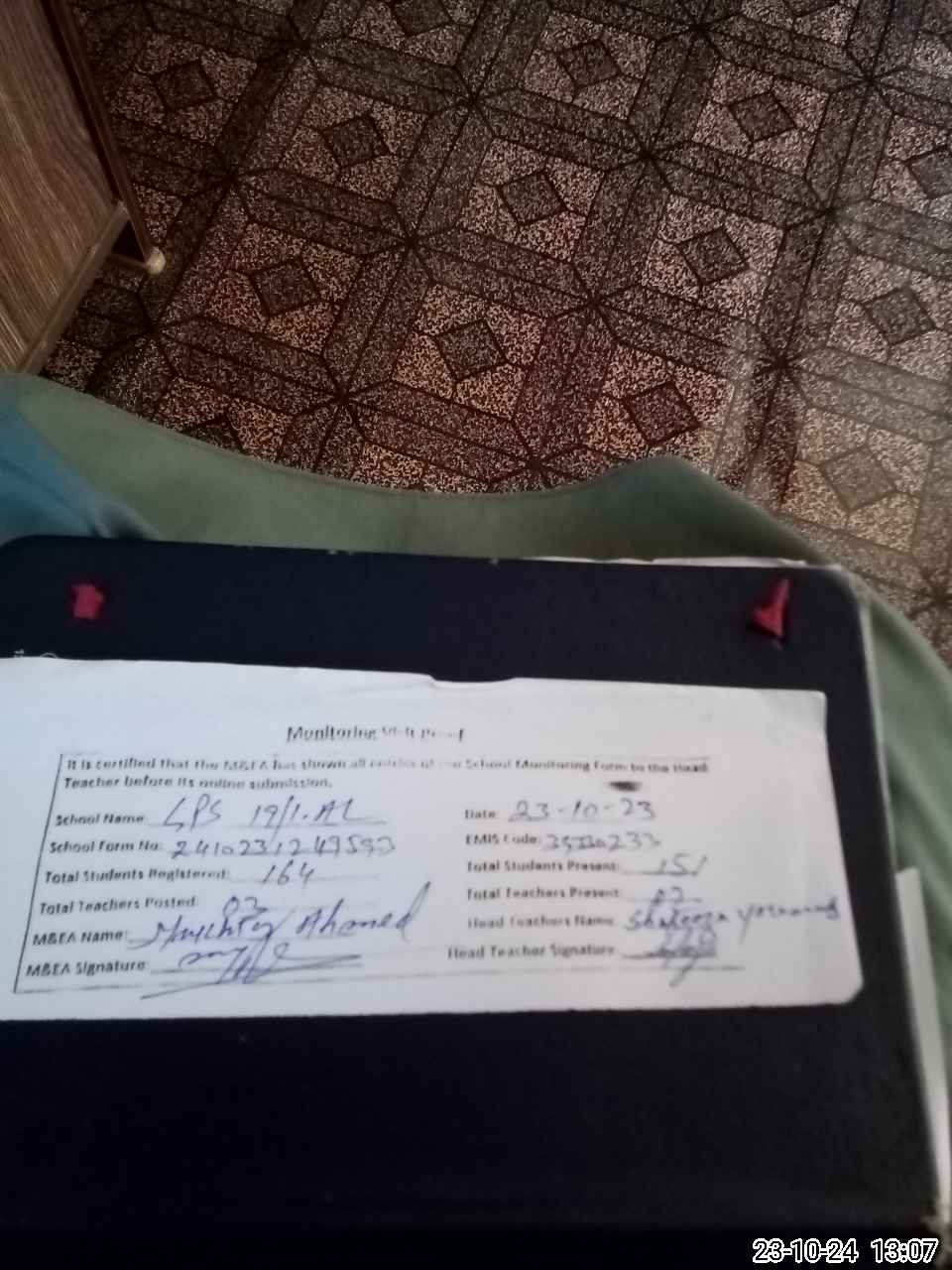 | Certified that this School was Inspected by the Undersigned MEA/DMO Today and the Information Stated Above is as Per Record. | |||||