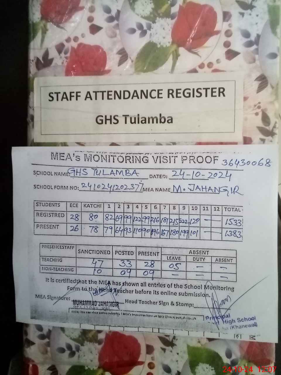| Attendance Register | Head Teacher | MEA with School | Visit Proof |