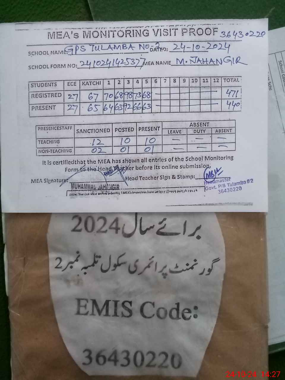 | Attendance Register | Head Teacher | MEA with School | Visit Proof |