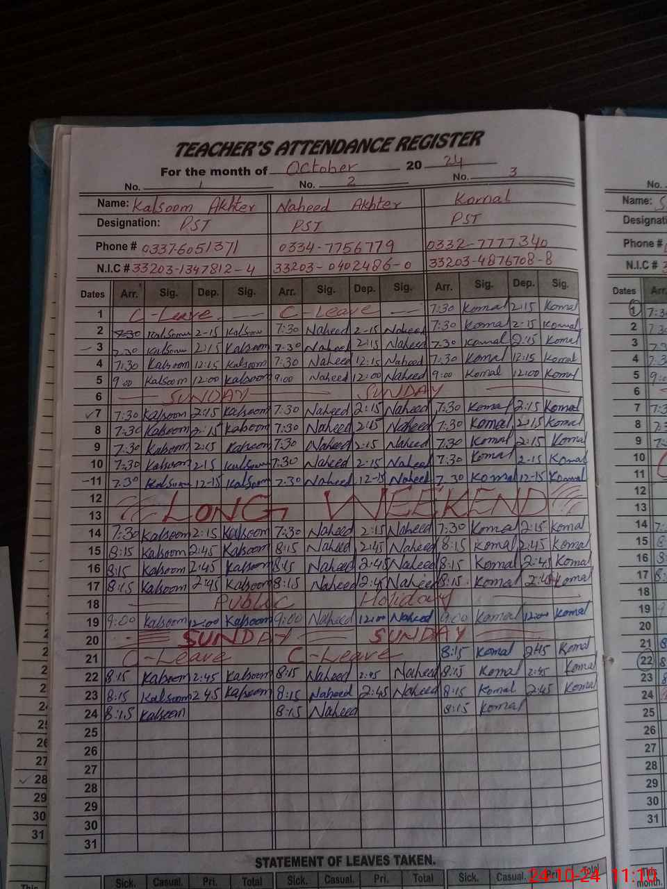 | CNIC | Full Name | Designation | R/C | Absence During Last Calender Month |