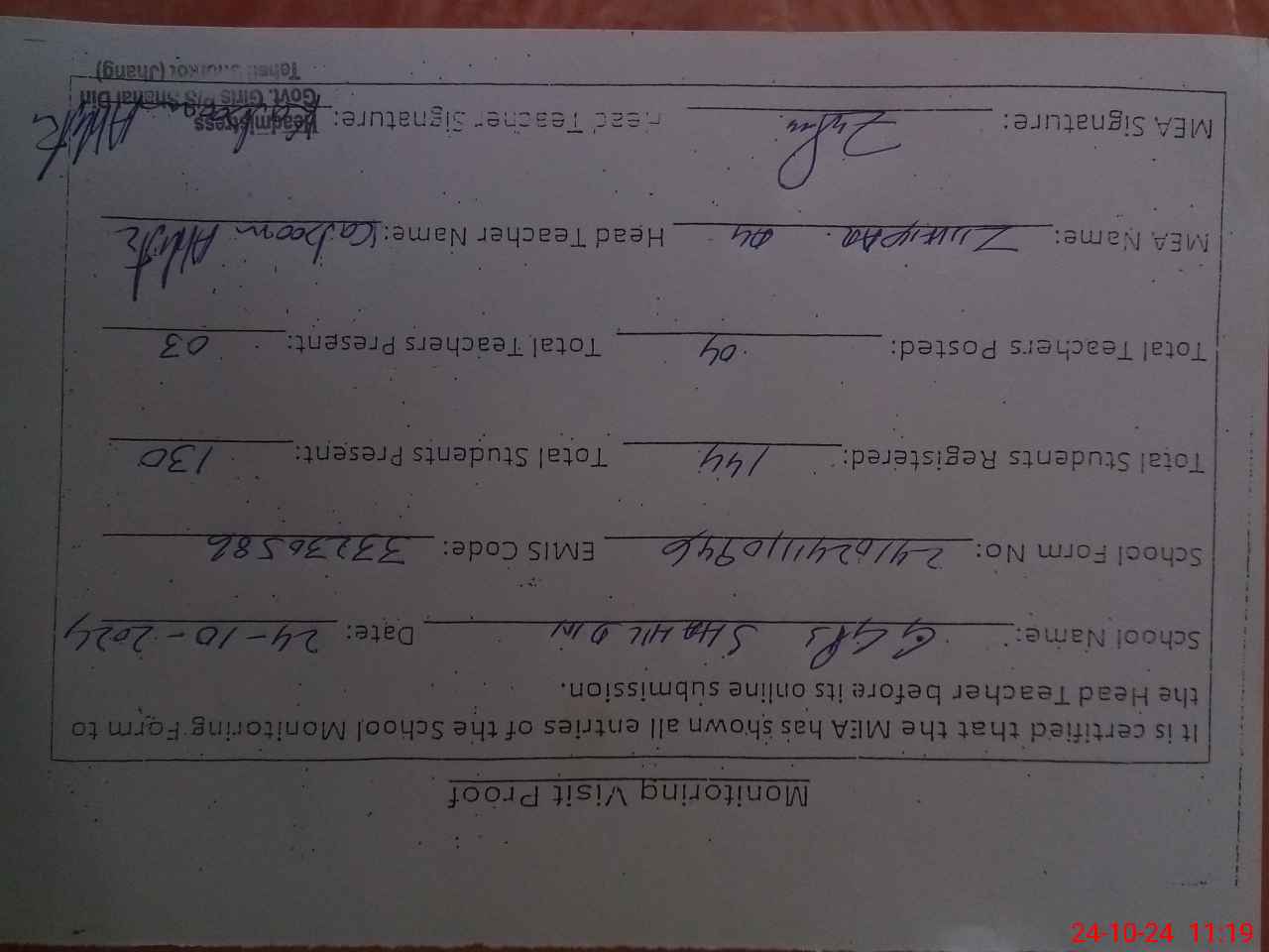 | Attendance Register | Head Teacher | MEA with School | Visit Proof |