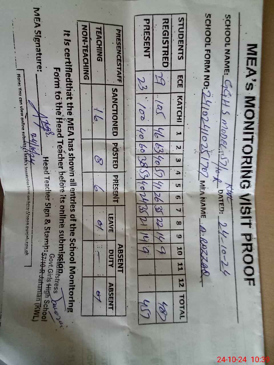 | Certified that this School was Inspected by the Undersigned MEA/DMO Today and the Information Stated Above is as Per Record. | |||||