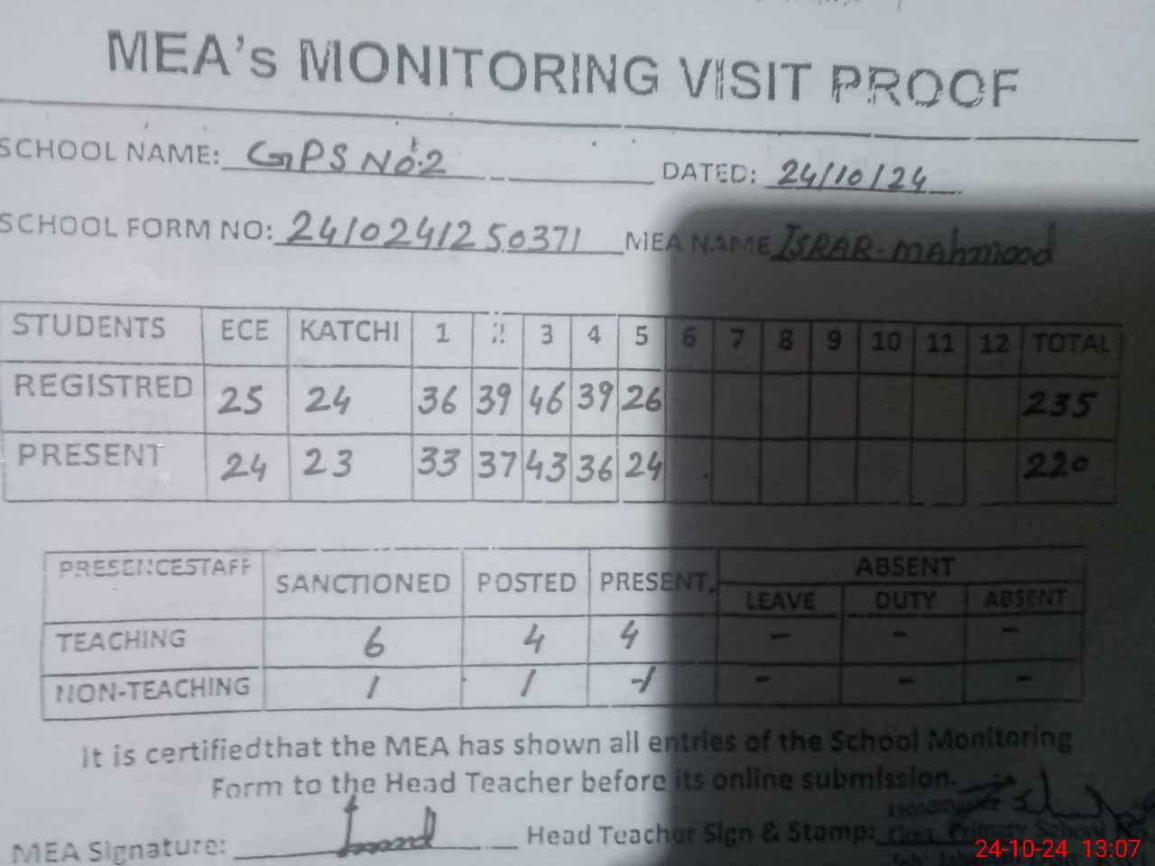 | Attendance Register | Head Teacher | MEA with School | Visit Proof |
