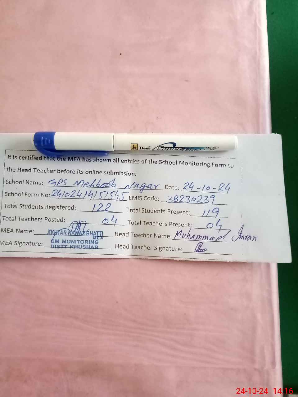 | Certified that this School was Inspected by the Undersigned MEA/DMO Today and the Information Stated Above is as Per Record. | |||||