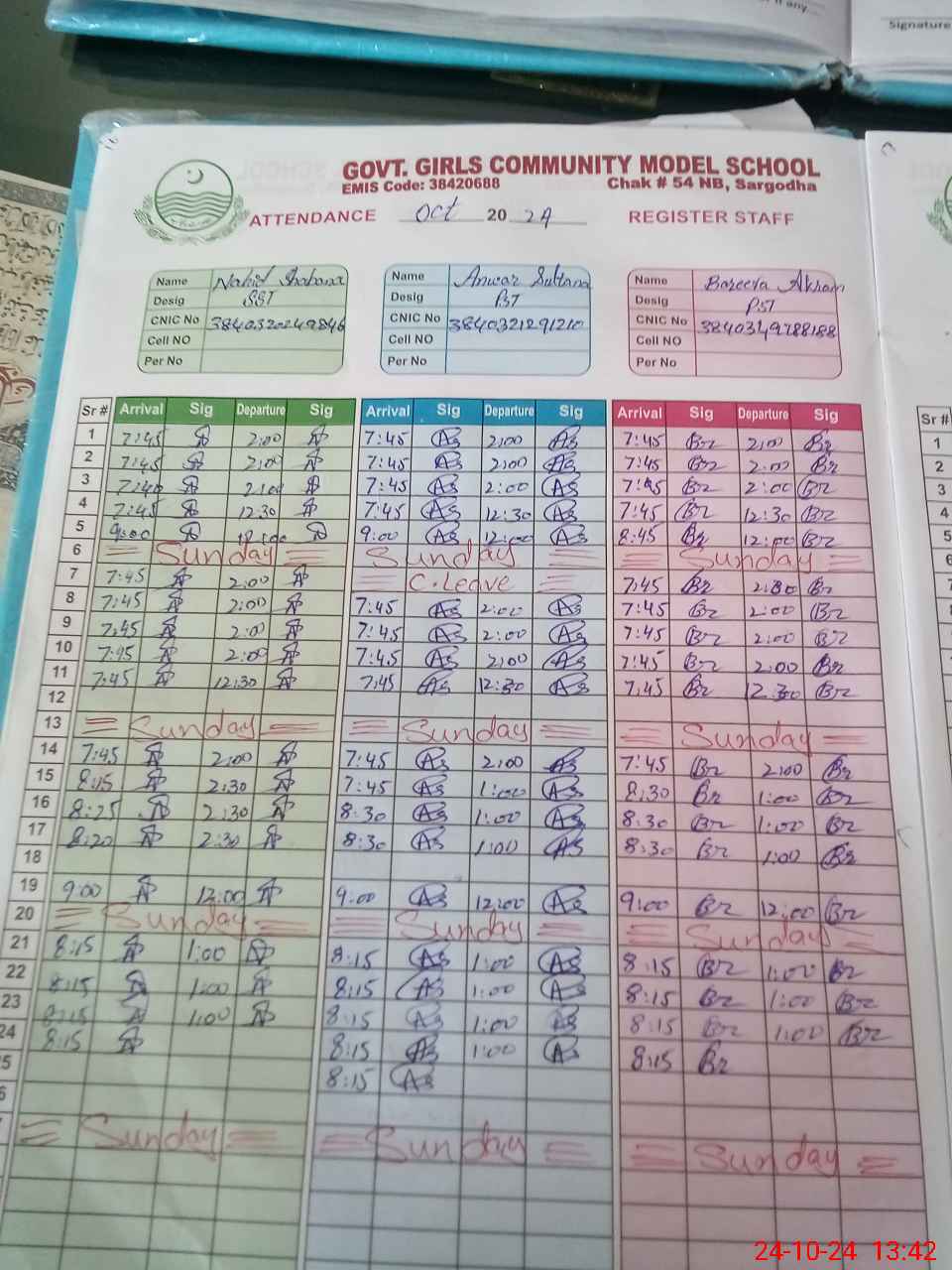 | CNIC | Full Name | Designation | R/C | Absence During Last Calender Month |