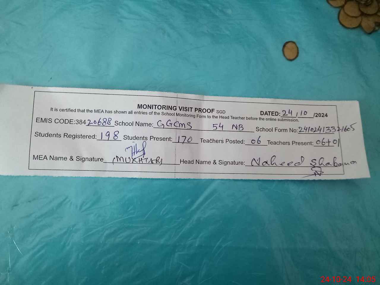 | Remarks (Use Separate Page if Required): Head Teacher Nahid Shabana SST Sc name is not available but she is present in the school | |||||