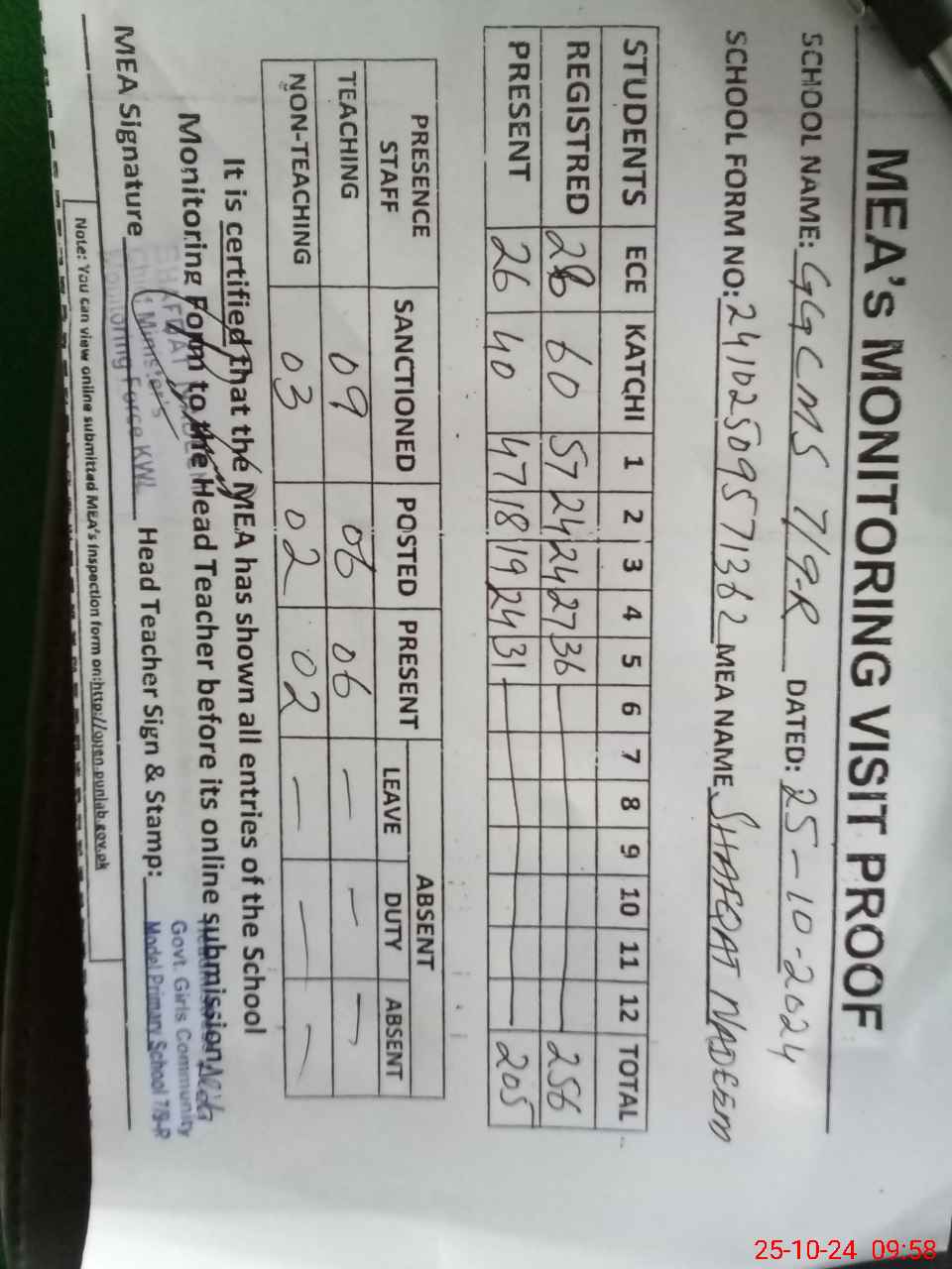 | Certified that this School was Inspected by the Undersigned MEA/DMO Today and the Information Stated Above is as Per Record. | |||||