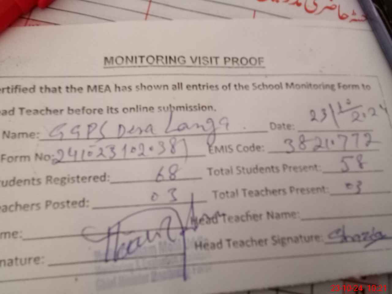 | Attendance Register | Head Teacher | MEA with School | Visit Proof |