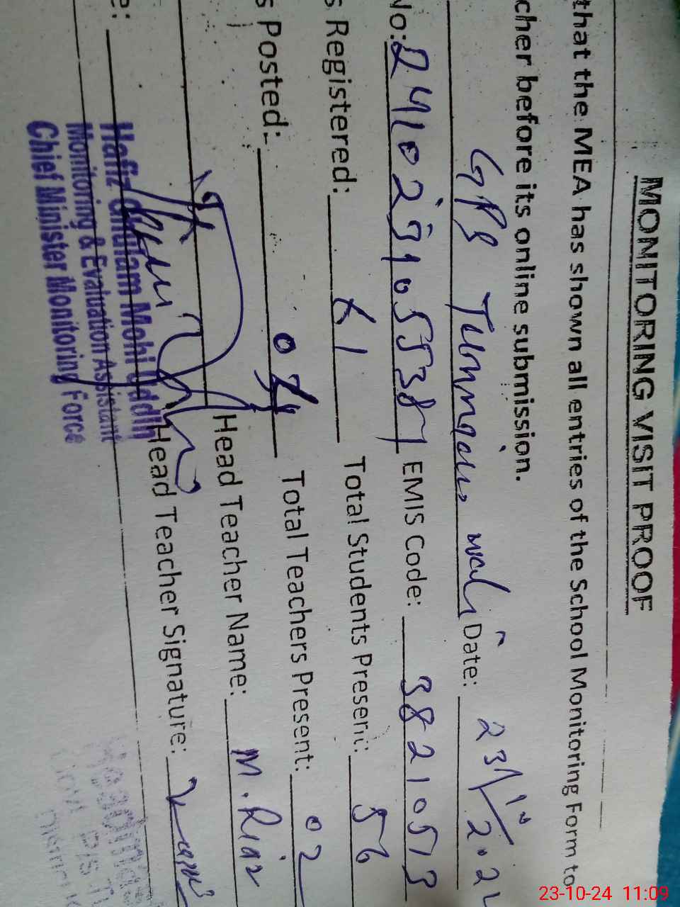 | Name: Mu**** Ri**** Designation: (School Headmaster's/Headmistress's) PST Phone/Cell Number: 03**** |