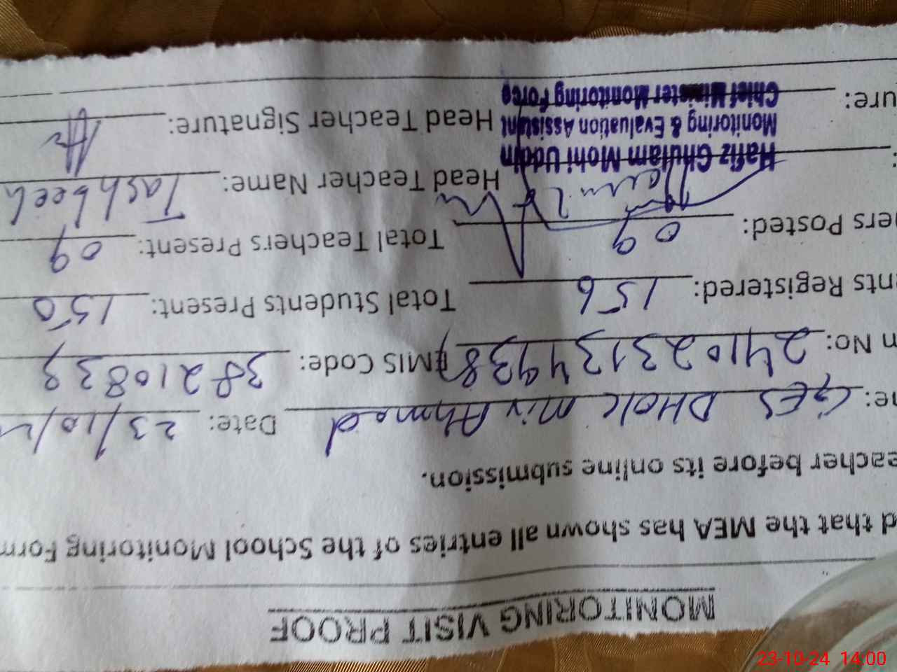 | Name: Ta**** UlHa**** Designation: (School Headmaster's/Headmistress's) SST Phone/Cell Number: 03**** |