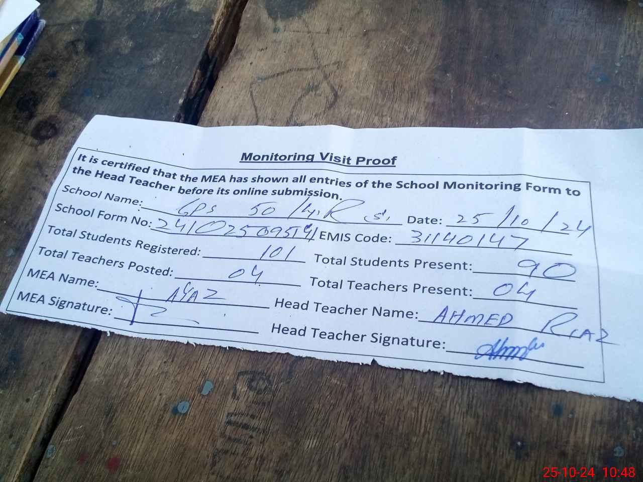 | Attendance Register | Head Teacher | MEA with School | Visit Proof |