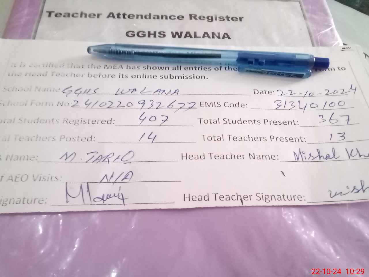 | Attendance Register | Head Teacher | MEA with School | Visit Proof |