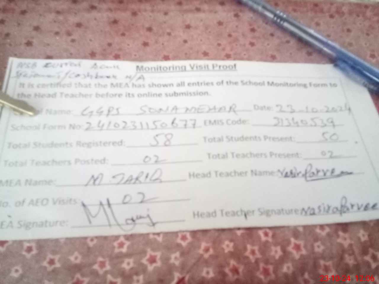 | Attendance Register | Head Teacher | MEA with School | Visit Proof |