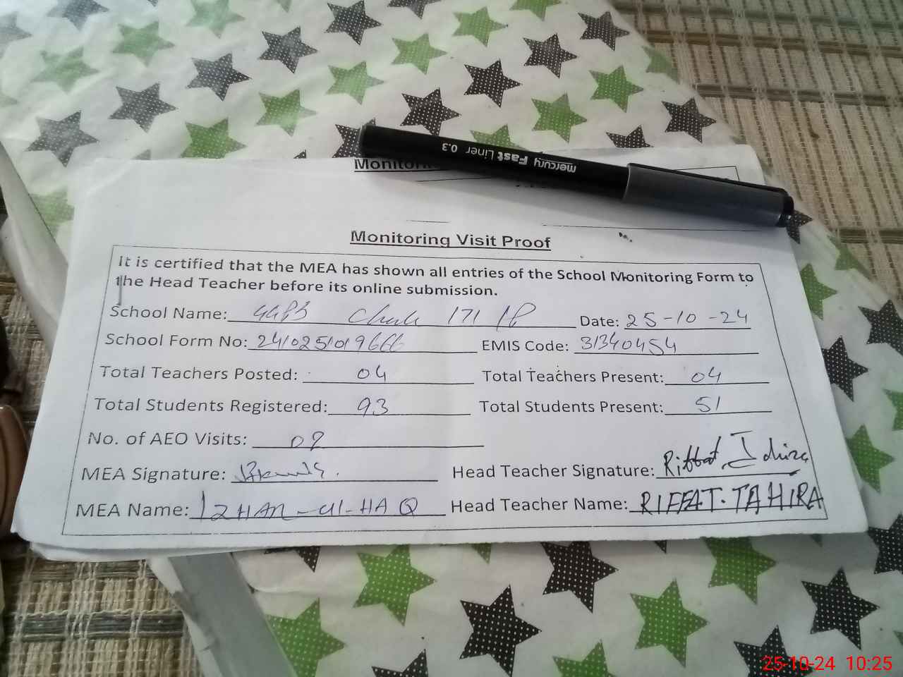 | Monitoring Date: 25-10-2024 | Start Time: 25-10-2024 09:59 AM | End Time: 25-10-2024 10:27 AM | Name of MEA: Mu**** Iz**** UlHa**** | |