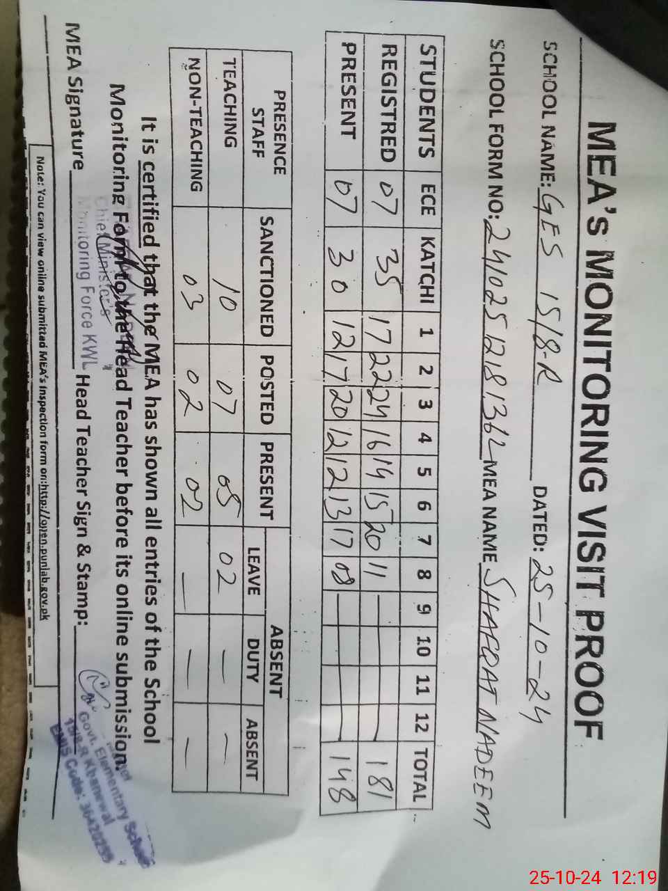 | Certified that this School was Inspected by the Undersigned MEA/DMO Today and the Information Stated Above is as Per Record. | |||||