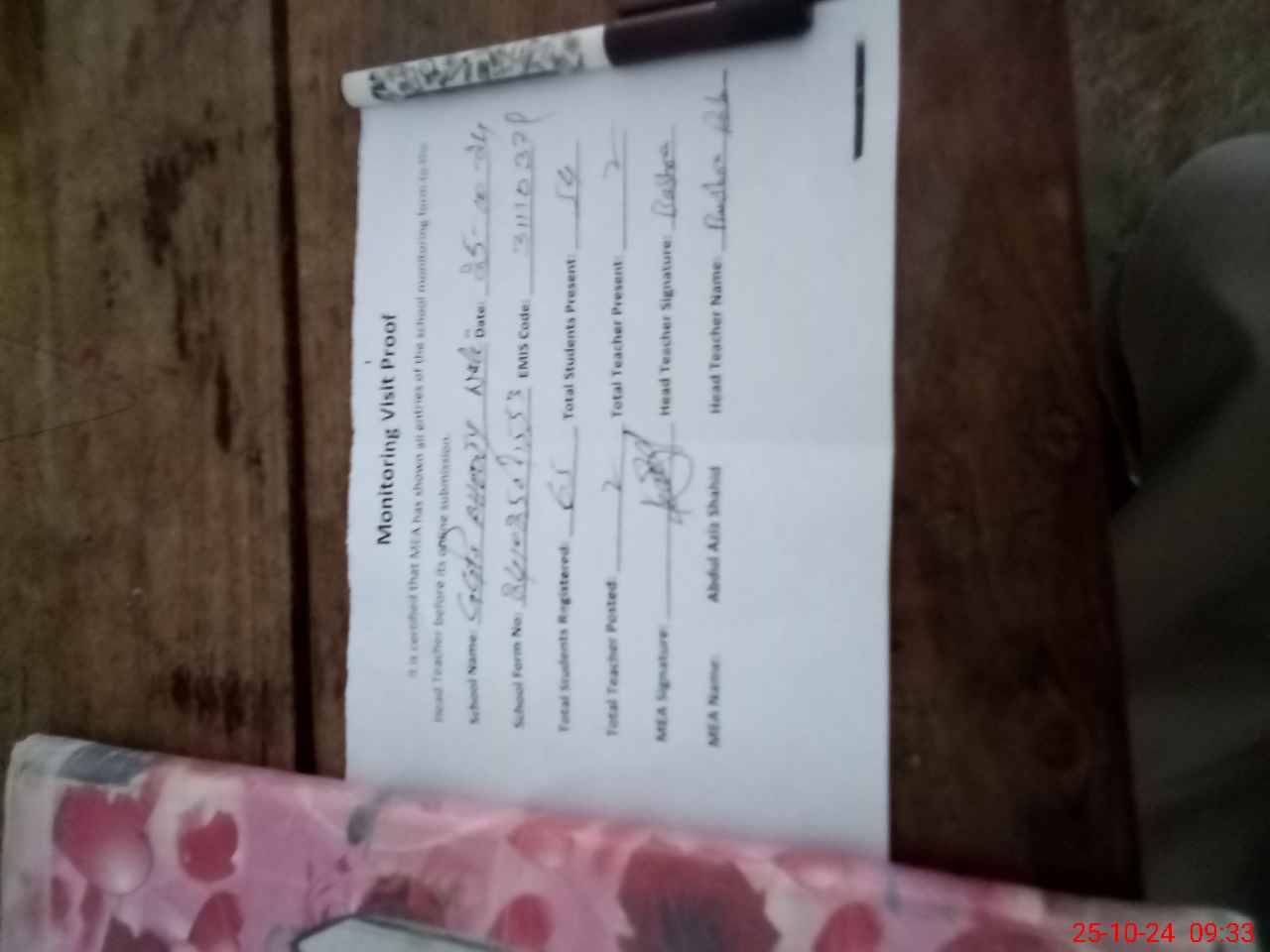 | Attendance Register | Head Teacher | MEA with School | Visit Proof |