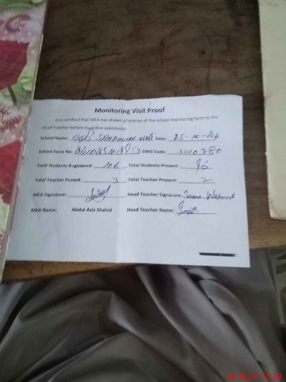 | Certified that this School was Inspected by the Undersigned MEA/DMO Today and the Information Stated Above is as Per Record. | |||||