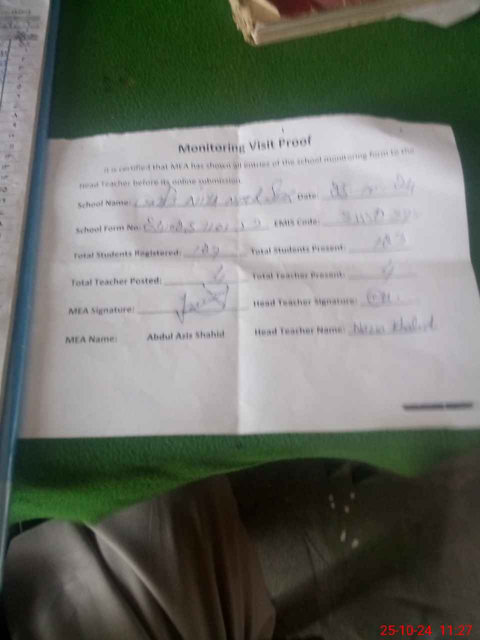 | Attendance Register | Head Teacher | MEA with School | Visit Proof |