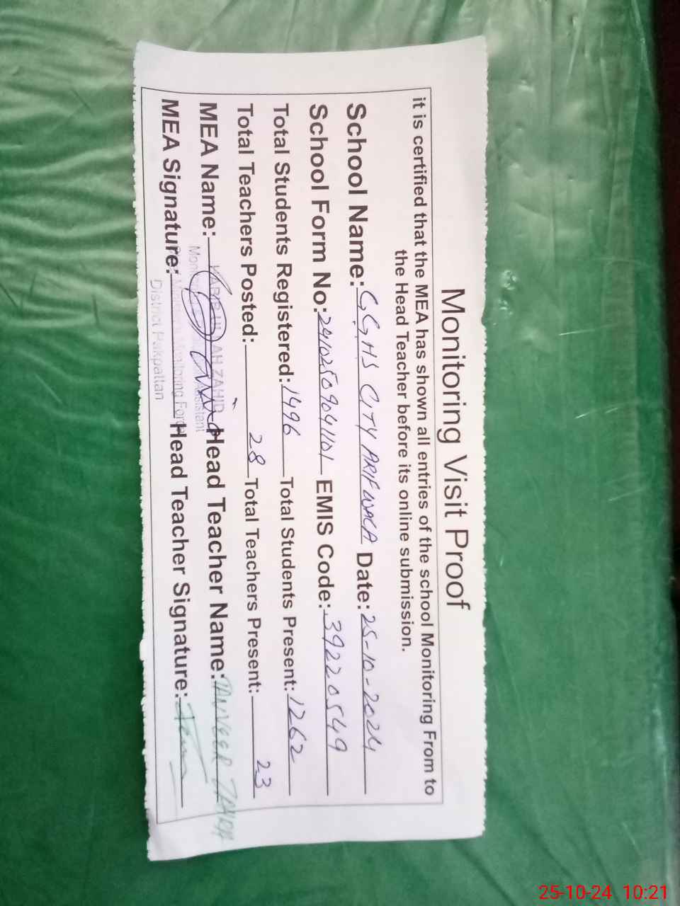 | Attendance Register | Head Teacher | MEA with School | Visit Proof |