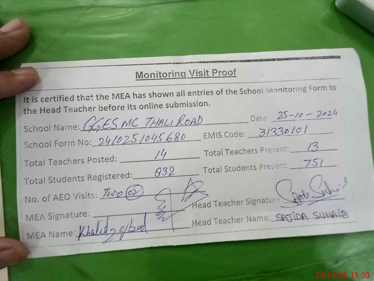 | Monitoring Date: 25-10-2024 | Start Time: 25-10-2024 10:45 AM | End Time: 25-10-2024 11:31 AM | Name of MEA: Kh**** Iq**** | |